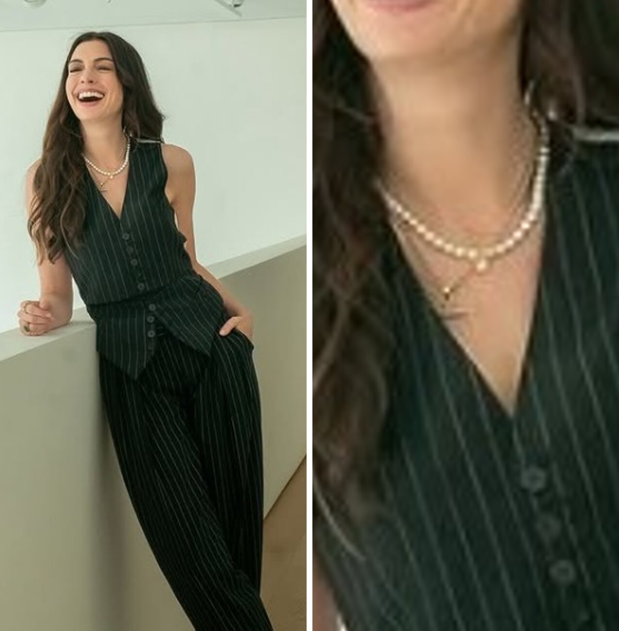 其中一套穿搭,是剪裁俐落的條紋西服套裝。我注意到的是,她還搭配了珍珠項鍊,再疊戴金色項鍊。
